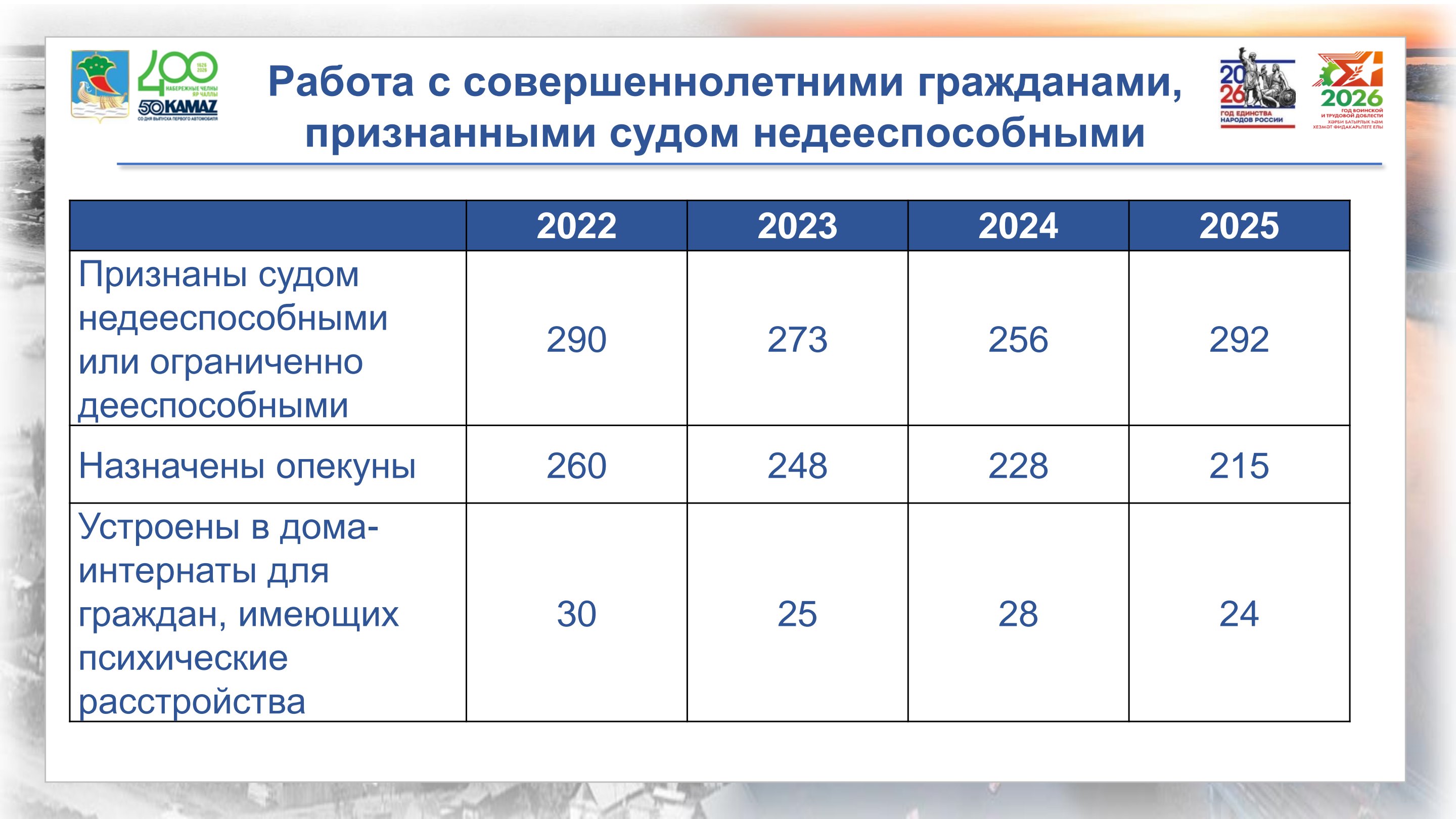 За 2025 год признаны недееспособными и ограниченно дееспособными 292 человека. 24 устроены в дома-интернаты, предназначенные для граждан, имеющих психические расстройства. Над остальными недееспособными гражданами оформлена опека (попечительство).