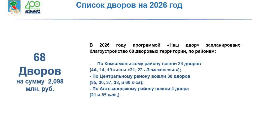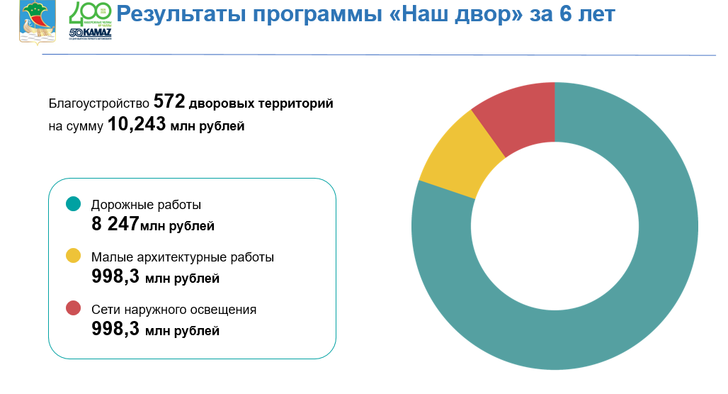 В 2025 году программа охватила 79 дворов: 35 − в Комсомольском районе, по 22 − в Центральном и Автозаводском, что улучшило условия для 78 тыс. челнинцев. Общий лимит составил 2,3 млрд рублей: отремонтированы дороги, установлено освещение и малые архитектурные формы. В отдельной практике «Вдохнуть жизнь в благоустроенные дворы» художественно оформлена трансформаторная подстанция в поселке ГЭС.