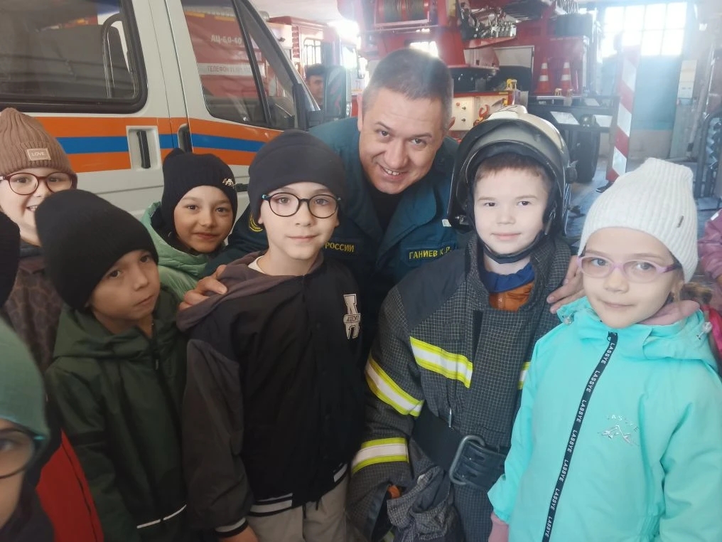 Экскурсоводом выступил помощник начальника караула, старший прапорщик Камиль Ганиев. Он показал ребятам, как устроена пожарная машина изнутри, разрешил посидеть в кабине и примерить боевую одежду пожарного.